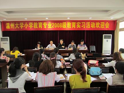 金秋十月,又是实习的季节了,虽然我院本学期参加实习的专业和人数迎来了新高,但是本次实习工作依然能在紧张而有序的进行着。在学院领导以及小教系领导和老师的关心与支持下,昨天08级小教本一、本二37名同学正式进瑞安市安阳实验小学和瑞安市锦湖实验小学实习,两所学校为我们小教系实习生的到来,特地召开了热烈的入点欢迎会。