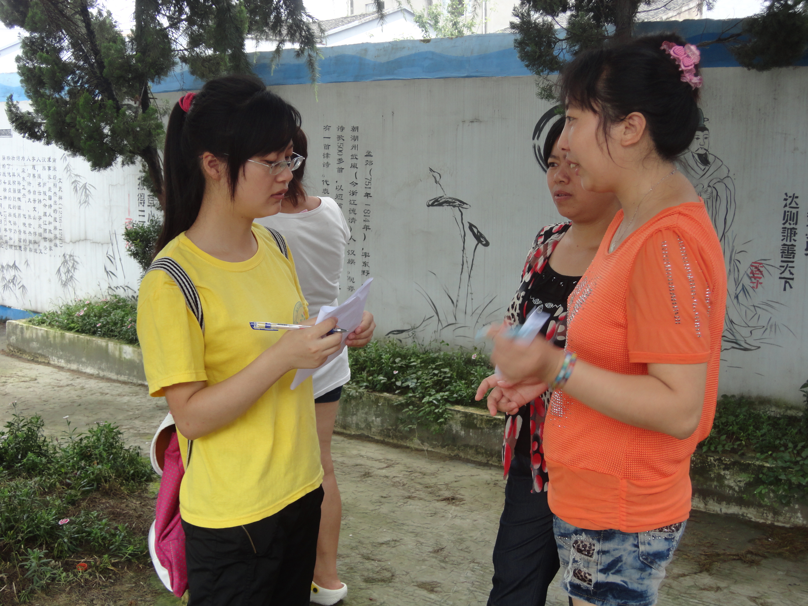 今天是七月的第一天,天空中火辣辣的太阳依旧尽情释放着它的热情。我们小学主课教师兼课情况调查实践队的队员们在炎热的午后走街串巷与树荫下纳凉的学生家长们侃侃而谈。气氛非常融洽、和谐。大家都洋溢在高兴的气氛中。