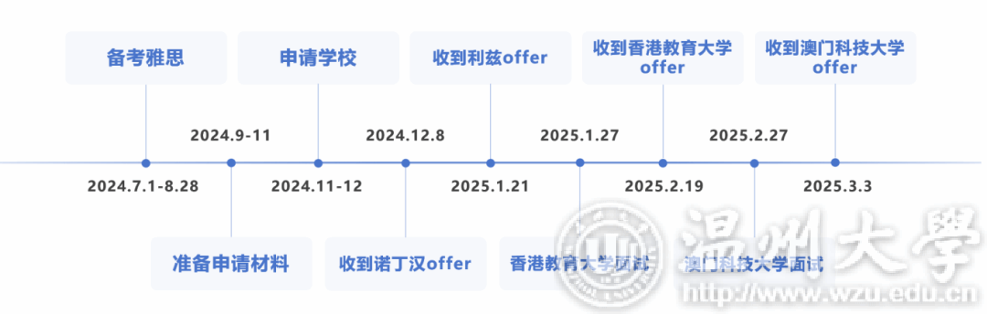 我想先向大家介绍一下留学的全过程:选定目标院校、准备申请材料、报名、面试、等待offer。不同学校的流程是不一样的,比如港澳地区的院校需要面试后才能等offer,而英国的一些学校则会直接发放offer conditional offer(有条件录取)。可以在小红书上查看各院校专业往年的录取方式。以下是我的时间线,接下来我将从选择学校、是否选择中介、语言准备等方面分享我的经验。