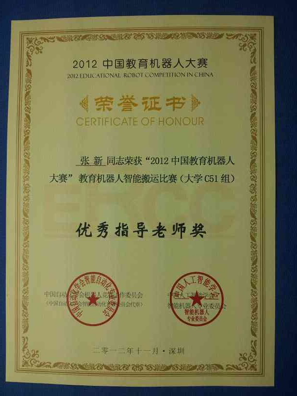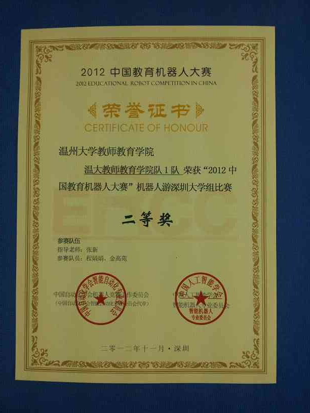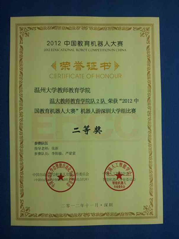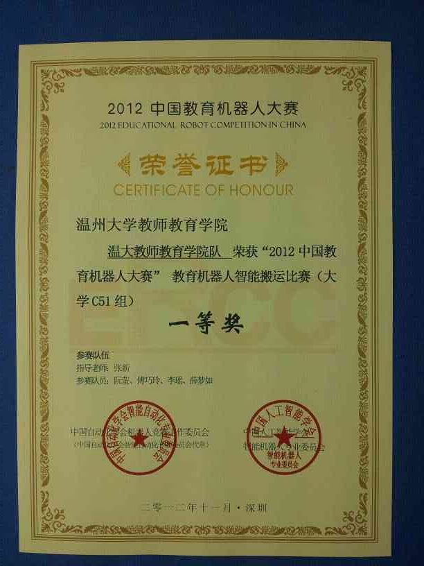 1124-25日,由中国自动化学会机器人竞赛工作委员会与中国人工智能学会智能机器人专业委员会联合主办的“2012中国教育机器人大赛”在深圳大学体育馆举行。在有全国50多所高等院校参赛强手如林的比赛中由我院张新老师指导的学生阮萤、傅巧玲、薛梦如、李瑶组成的温大williamhill官网智能搬运队荣获教育机器人智能搬运比赛(大学C51组)一等奖。程娟娟、金高苑技组成的温大williamhill官网机器人深圳游1队李陈敏、严蒙蒙组成的温大williamhill官网机器人深圳游2队荣获教育机器人机器人游深圳比赛(大学组)二等奖。此外,由于我院三支参赛队伍成绩突出,张新老师荣获优秀指导老师奖。