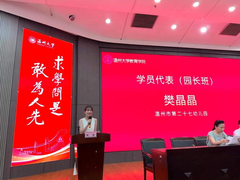 温州市第二十七幼副园长樊晶晶代表园长班发言。樊园长借由英国科幻小说家阿瑟·克拉克的话:“我从来没有长大,但我从来没有停止过成长。”为此次培训期间的所学所感做了总结。并表达了学员们的共同心声:未来将成为怎样的园长完全取决于自己脚下,生命的体验有许多,最宝贵是重新认识自己,且惊讶于自己的坚韧。