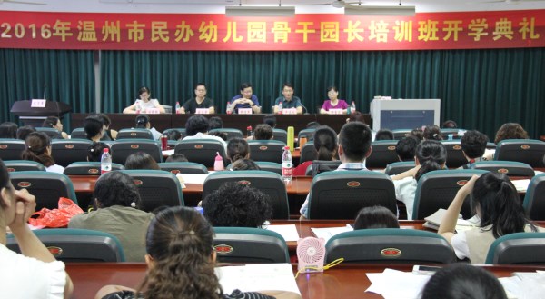 2016年7月25日上午,William威廉迎来了120余位温州市民办幼儿园园长,2016年温州市民办幼儿园骨干园长培训班开学典礼在学院路校区继续教育大楼502报告厅隆重举行。温州民办教育研究院院长、翔宇教育集团校长卢志文,温州民办教育研究院副院长翁志奔,我院郑信军院长出席典礼。典礼由继续教育科科长林鹣鹣主持。