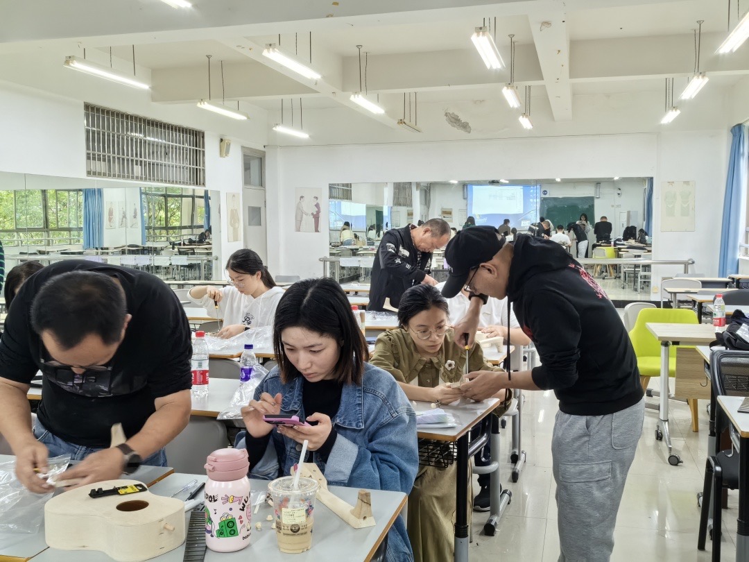 在蔡老师的带领下,学员们开展了关于物质科学领域的趣味实验设计与制作——“声音”单元的部分实验教学与设计,并带领学员们共同制作了尤克里里。在制作过程中,学员们热情高涨,分别制作了各具特色的专属小琴。通过结构解析,对琴头、琴枕、琴弦、指板、音孔等各个部位进行了深入了解,掌握了尤克里里的发声技巧,并通过蔡老师出彩的弹唱教学,学会了基础的弹奏技巧,实现了学科融合,创意学习。