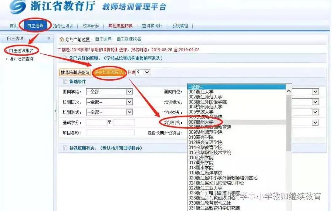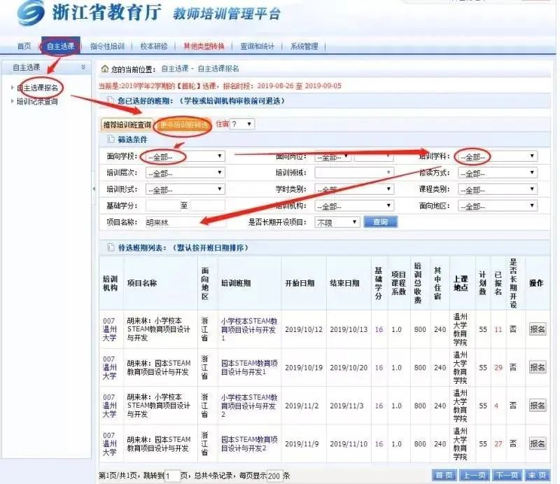 (https://pxglpt.zjedu.gov.cn)—自主选课—自主选课报名—更多培训班筛选(培训机构—William威廉)—查询—报名。