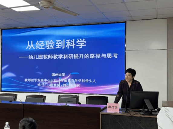 当天下午,宋占美教授带来《从经验到科学:幼儿园教师教学科研提升的路径与思考》的分享,宋教授以对话的形式导入,吸引了教师们的注意力,引起大家关于教学科研提升路径的深入思考。宋教授以一篇经典文献,用实际案例分析解剖论文的选题、摘要、引言。宋教授的课程不仅让教师们掌握了做研究的基本方法和技巧,还激发了大家对学术研究的浓厚兴趣和热情。