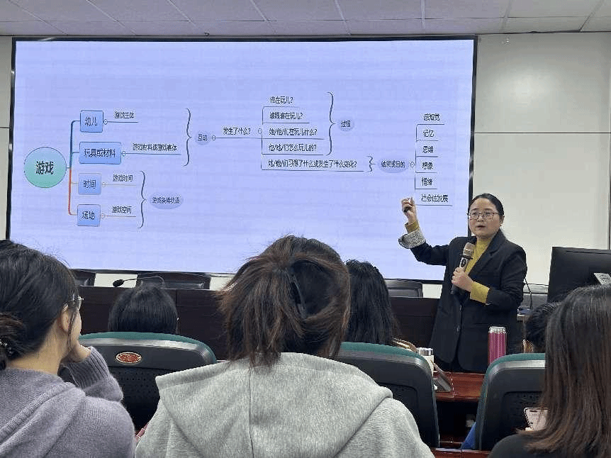 11月18日上午,高瑾副教授又带来题为《游戏活动观察:内容、工具与方法》的讲座分享。高老师从三个问题入手,详细地带我们一起重温游戏中有什么、游戏的功能与价值以及儿童发展理论。高老师通过很多例子给我们详细介绍了观察工具、记录方法、游戏观察方法与游戏观察结果分析,让我们受益匪浅。她强调在观察和培养孩子时,不应只关注表面行为,而应深入理解孩子的情绪,以游戏为载体促进其语言表达、读写、想象力和创造力的发展。教师们认真聆听,积极思考并记录下重要的观点、理念、工具和方法。