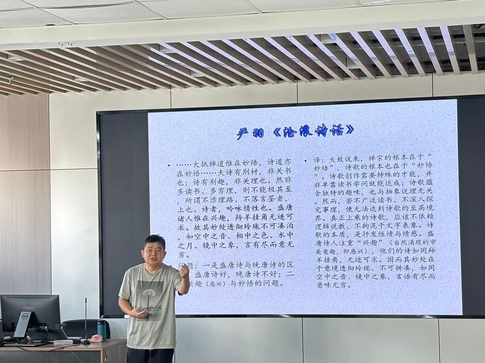 课程中,苏老师还详细阐释了严羽《沧浪诗话》的“感兴—妙悟”理论。他以王维《山中》为例,剖析了从真切观察到审美升华的过程。并指出王之涣《登鹳雀楼》因缺乏“出人意料的妙悟”,未能达到唐诗巅峰。此外,他引入弗洛伊德理论,提出“恢复对象本真感觉,方能捕捉文学性”的观点。