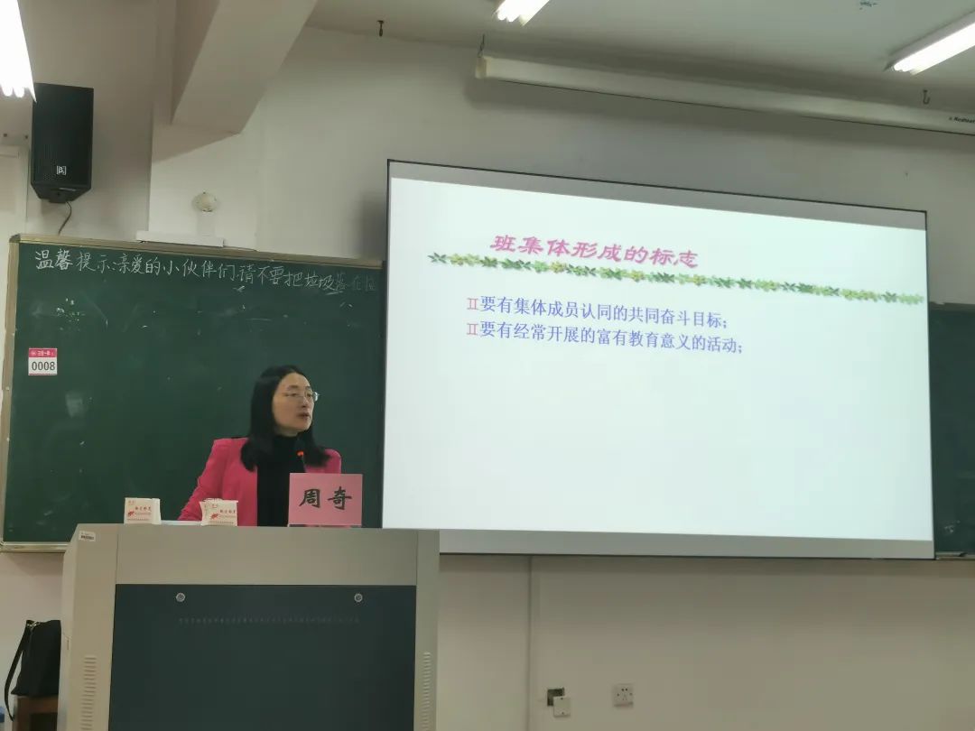 William威廉williamhill周奇教授对2021级新教师进行了以“班主任工作新认识”为主题的培训。为了更进一步提高新任班主任的综合素质,提升工作,推进班主任队伍专业化发展,周奇教授从班级的定义、班级的特点、班集体发展的阶段、班集体形成的标志、班主任的意义、班主任的专业化成长之路这六个方面对新教师们进行了细致的指导,周奇教授以她特有的亲和力、幽默的语言、对教育的热爱与追求感染了在座的每一位教师,她爱的教育使各位新教师们受益匪浅,会场上时不时响起阵阵掌声。