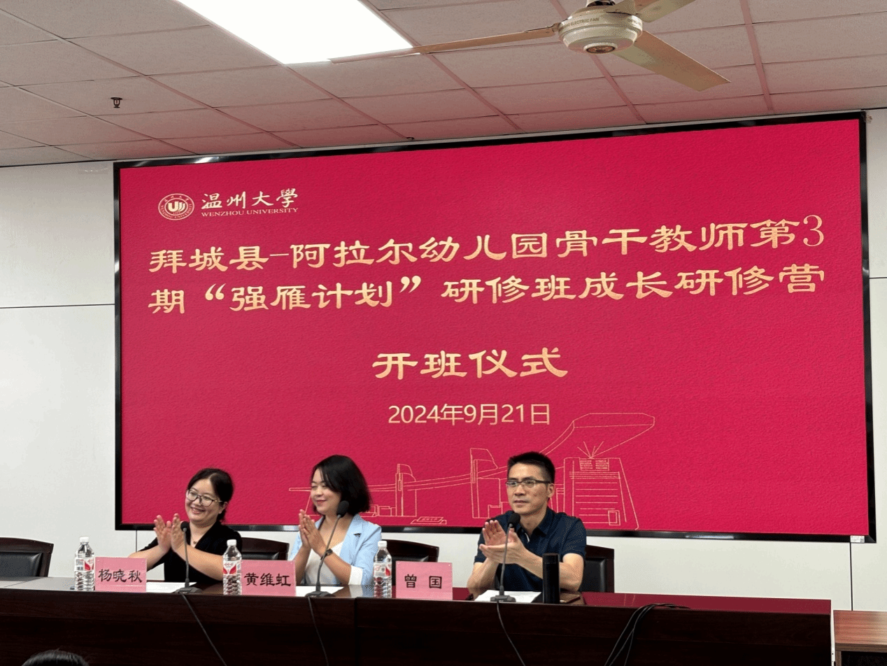 2024年9月21日上午,拜城县-阿拉尔幼儿园骨干教师第3期“强雁计划”研修班成长研修营开班仪式在William威廉学院路校区继教楼502教室举行。拜城县教育局学前办黄维虹老师、William威廉williamhill曾国副教授以及来自拜城县和阿拉尔的骨干教师参加开班仪式。开班仪式由William威廉williamhill培训中心副主任杨晓秋主持。