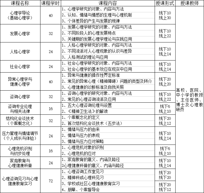 注:完成助理心理咨询师全部课程学习,其中心理学、教育学、 社会工作、精神医学等专业学历教育阶段已修合格的相关课程可以申请免修。