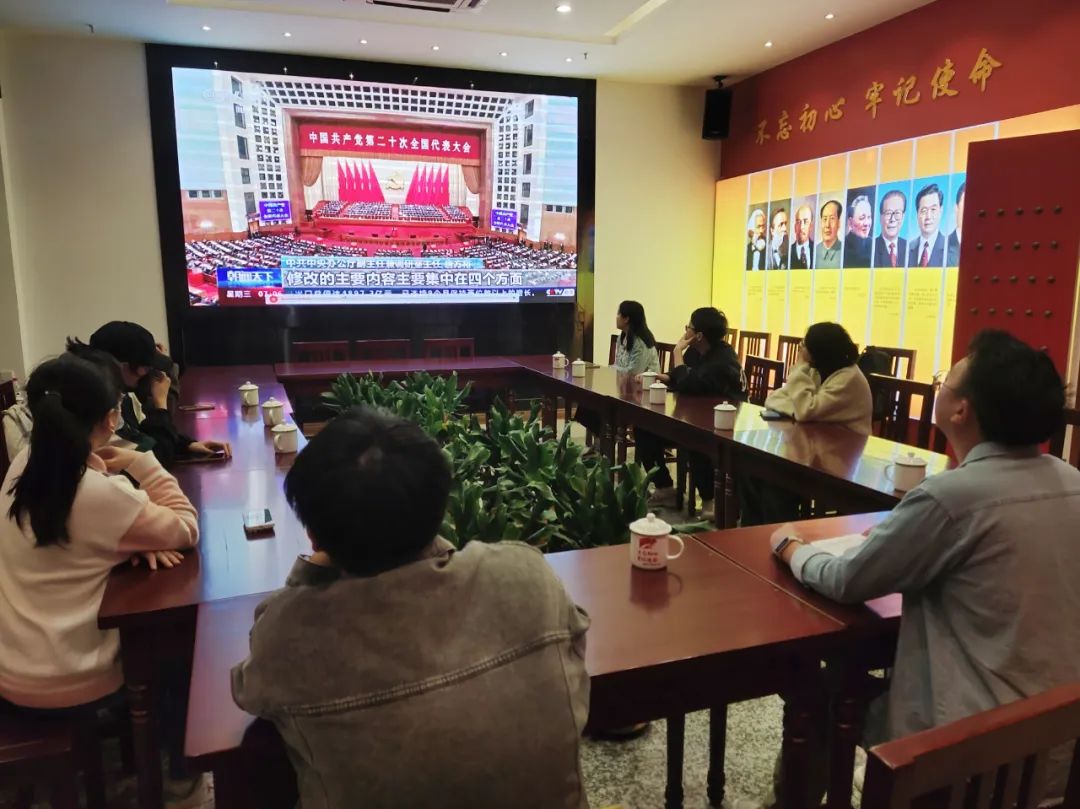与会人员一起观看视频《新征程上党旗飘扬 党章修改内容主要集中在四个方面》,党支部书记孟江龙领学《中国共产党章程》(2022年新旧对照版),党的二十大通过的党章修正案,共修改50处,其中总纲部分的修改37处,条文部分的修改13处。与会人员一同观看视频《原原本本学报告|党的二十大的主题是对大会内容和精神的高度概括》和《中国共产党第二十届中央政治局常委同中外记者见面会》。