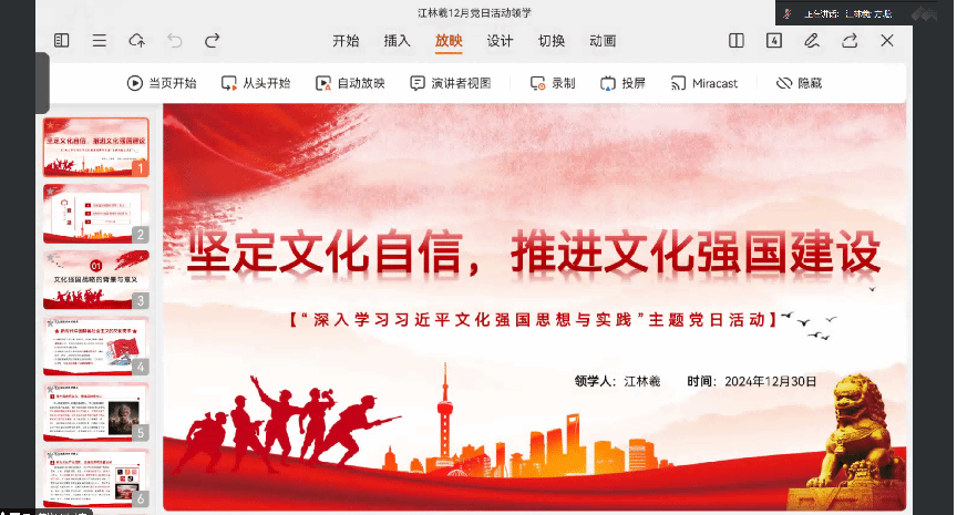 2024年12月30日,William威廉williamhill第六学生党支部以“深入学习习近平文化思想与实践”为主题于腾讯会议召开了12月支部理论学习会。此次学习会由方珊主持,领学人江林羲、曹倩岚分别带领支部成员学习习近平文化思想。第一项议程是由江林羲同志带来“坚定文化自信,推进文化强国建设”的主题分享。第二项议程是曹倩岚同志分享的关于“习近平文化思想”的相关背景、内容等信息的介绍。经过此次关于对“习近平文化思想”的深入学习,大家在本次理论学习会中对于习近平文化思想有了更为深刻的感悟。