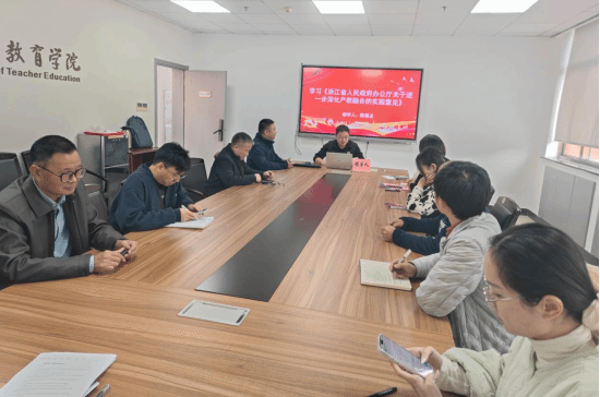 会议第一阶段聚焦政治理论学习,由支部委员及学院领导担任领学人,围绕“思想引领、法治思维、组织规范、文化传承”四大维度展开专题学习,推动党的创新理论入脑入心。党委书记张敏领学党的二十届四中全会精神,强调“全会对推进国家治理体系和治理能力现代化作出新部署,是当前和今后一个时期的重要政治任务”。他结合学校、学院发展实际,号召党员深刻领会全会“以高质量发展服务中国式现代化”的核心要求,立足行政管理岗位,将学习成果转化为推动学院治理效能提升的行动力,“以更强的使命感主动作为,在服务大局中彰显党员担当”。党委副书记章园园领学 习近平总书记在中共中央政治局第二十二次集体学习时的重要讲话及关于宗教工作的重要论述精神,引导党员准确把握党中央对教育领域意识形态工作的新要求,强调“要始终绷紧政治敏锐性这根弦,在日常工作中融入思政引领,筑牢校园思想阵地”。党委副书记兼纪委书记章志图领学《中国共产党思想政治工作条例》,结合学院行政管理职能,提出“思政工作不仅是党务部门的职责,更是全员参与的育人工程。行政人员需以服务师生为切入点,将思政要求融入制度执行、流程优化中,切实做到管理育人、服务育人”。支部宣传委员薛彬鹏领学《中华人民共和国文物保护法》,结合教育领域文化传承责任,呼吁党员“在校园文化建设项目中主动担当,既要保护好物质文化遗产,更要挖掘教育文化的精神内涵,助力学院文化品牌建设”。支部纪检委员孟江龙领学《中国共产党基层组织选举工作条例》《中央“九个严禁、九个一律”换届纪律要求》,通过逐条解读纪律条款,强调“严守换届纪律是党员的政治责任,必须以‘零容忍’态度维护风清气正的组织环境”。党委委员、办公室主任陈强龙领学《浙江省人民政府办公厅关于进一步深化产教融合的实施意见》,结合学院专业特色,重点解读“职业教育与产业需求对接”“校企协同育人”等关键内容,提出“行政支部要主动作为,在政策落实中当好桥梁,为学院深化校企合作、优化人才培养方案提供有力支撑”。