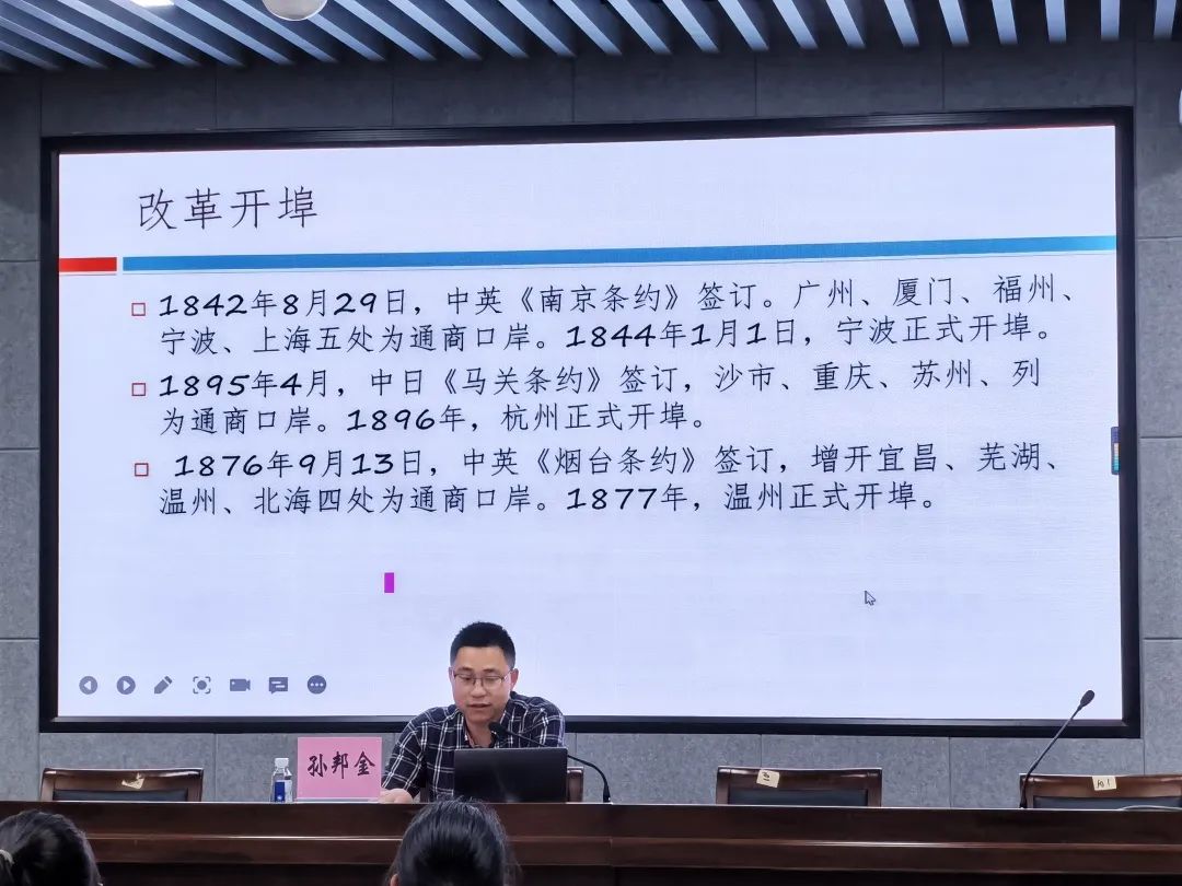 《形势与政策》课是高校学生思想政治教育的重要内容,是高校思想政治理论课的重要组成,是帮助大学生正确认识新时代国内外形势,深刻领会党和国家事业取得的历史性成就、发生的历史性变革、面临的历史性机遇和挑战的核心课程。2022年6月1日下午,我院采用线上和线下相结合的形式开展《温州改革开放史与新时代温州人精神》讲座,马克思主义学院副院长孙邦金教授担任本次课程主讲人。学院党委副书记章园园、学工办主任严晓秋、辅导员孟江龙一同听讲了本场报告。