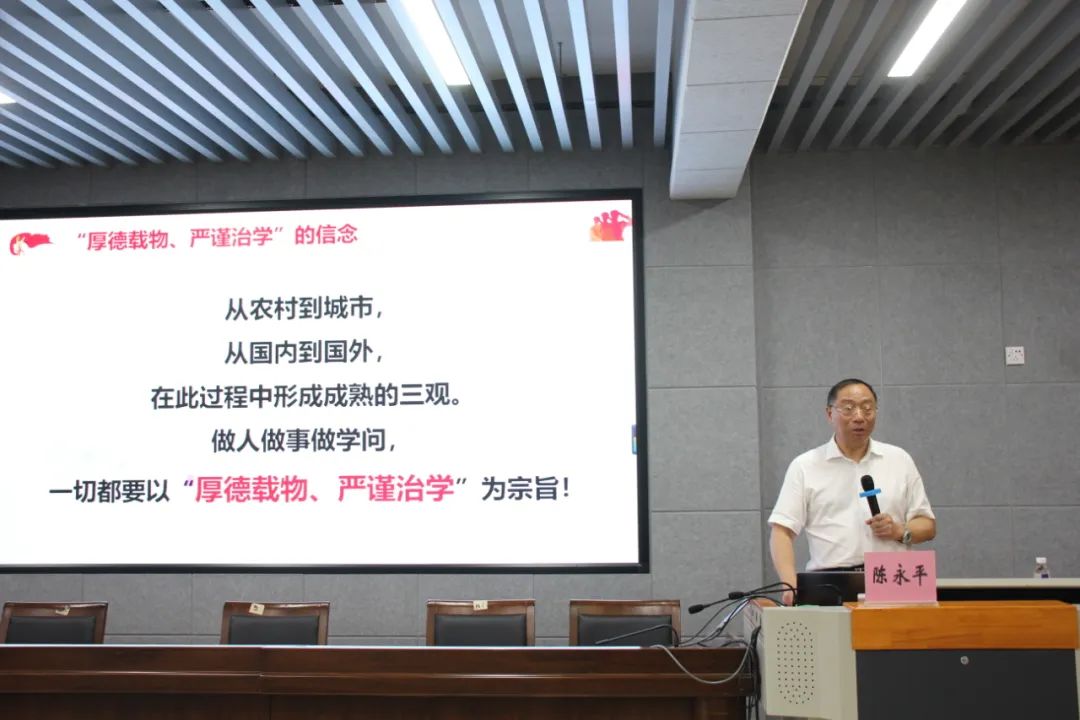 2020年全国劳动模范和先进工作者表彰大会在北京隆重召开,习近平总书记在会上作了重要讲话。陈永平教授先后从习近平总书记以及省、市委书记的讲话出发,深入解读了习近平总书记的重要讲话和省、市座谈会精神。针对“如何在成长成才过程中培养三观”这一问题,陈教授用自己的亲身经历阐述了坚持就是胜利。从农村到城市,从国内到国外,不论身在何处,做人做事做学问,一切都要以“厚德载物、严谨治学”为宗旨。
