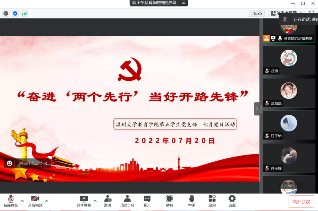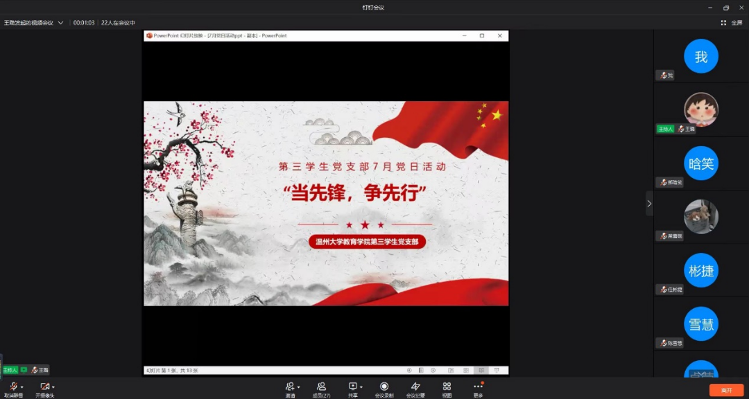 2022年7月13日,williamhill第三学生党支部在钉钉群中,以线上视频会议的方式举行了七月份的支部理论学习会。本次大会由王璐同志主持,第三学生党支部全体党员参加了此次会议。