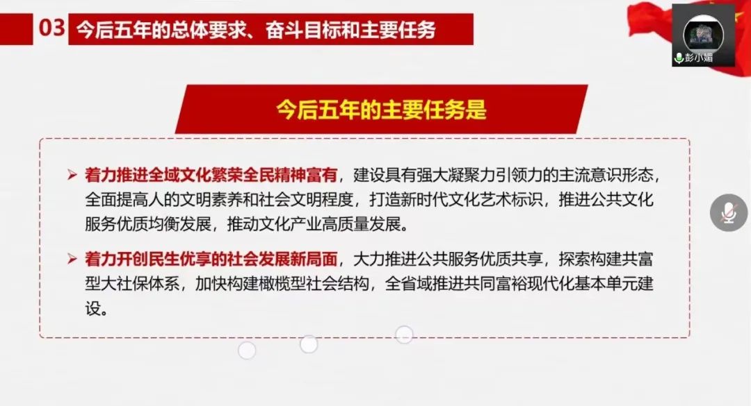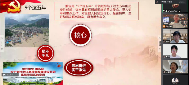 知心姐姐党支部结对行政党支部,会议伊始,由学院党委副书记、纪委书记、行政党支部书记彭小媚为同志们深入解读浙江省第十五次党代会报告。她将报告的四部分内容简要概述为成效、经验、奋斗目标和主要任务、机制保障,并一一展开相关内容的介绍与总结,思路清晰,言语精炼,在准确向同志们传达了报告精神的同时,鼓励同志们深入实践、勇于创新、敢于开拓。