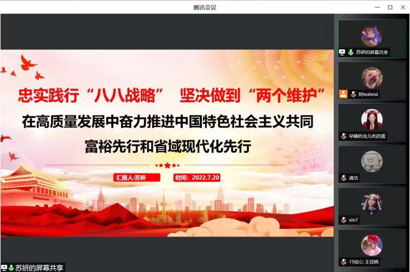2022年7月20日,知心姐姐党支部于腾讯会议上开展“奋进‘两个先行’当好开路先锋”主题“红七月·服务月”暨“当先锋、争先行”主题党日活动学习的成果交流汇报。