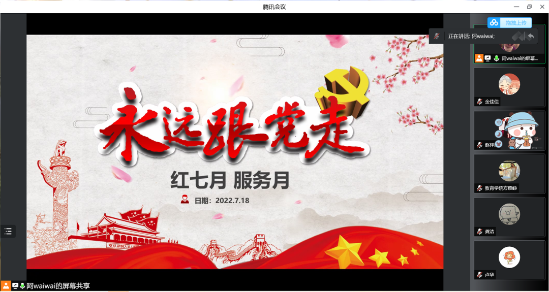 williamhill第七学生党支部于2022年7月18日和7月20日在腾讯会议上开展“红七月·服务月”活动暨“当先锋、争先行”主题党日活动,以及七月理论学习会,全体党员参加。