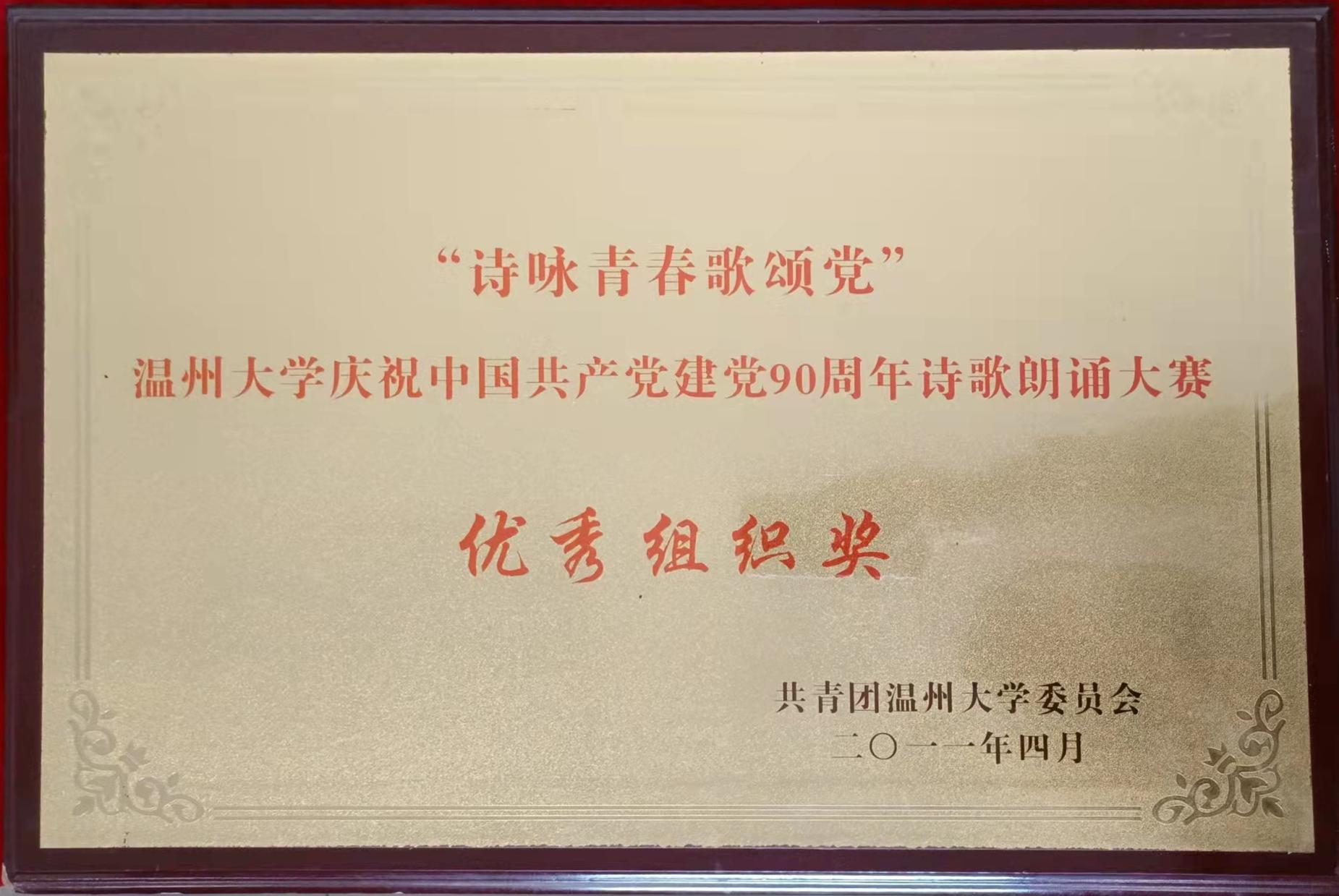 “诗咏青春歌颂党”William威廉庆祝中国共产党成立90周年诗歌朗诵大赛优秀组织奖(2011-4)