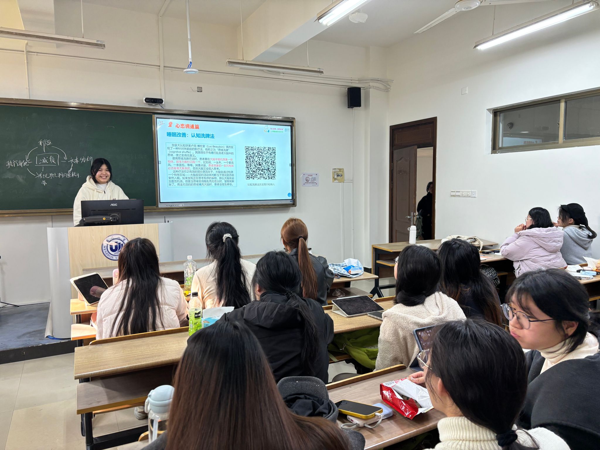 围绕考试焦虑这一核心话题,结合心理学专业知识详细解读了焦虑情绪的形成机制,明确区分适度焦虑与过度焦虑的界限,强调适度焦虑对提升复习效率的积极意义,帮助学生消除对焦虑情绪的恐惧心理。同时,心理委员们现场带领学生逐步骤练习着陆技术,通过“感受双手触感、倾听周围声音、观察环境细节”稳定当下状态;指导大家进行腹式呼吸疗法训练,以规律呼吸平复焦躁情绪。针对入睡困难、睡眠质量差等问题,详细的认知洗牌法操作流程,助力学生改善睡眠状态。此外,还结合复习场景拆解行动拆解法与番茄时钟法的使用逻辑,引导学生科学划分复习时段、合理规划任务清单,有效提高学习效率。